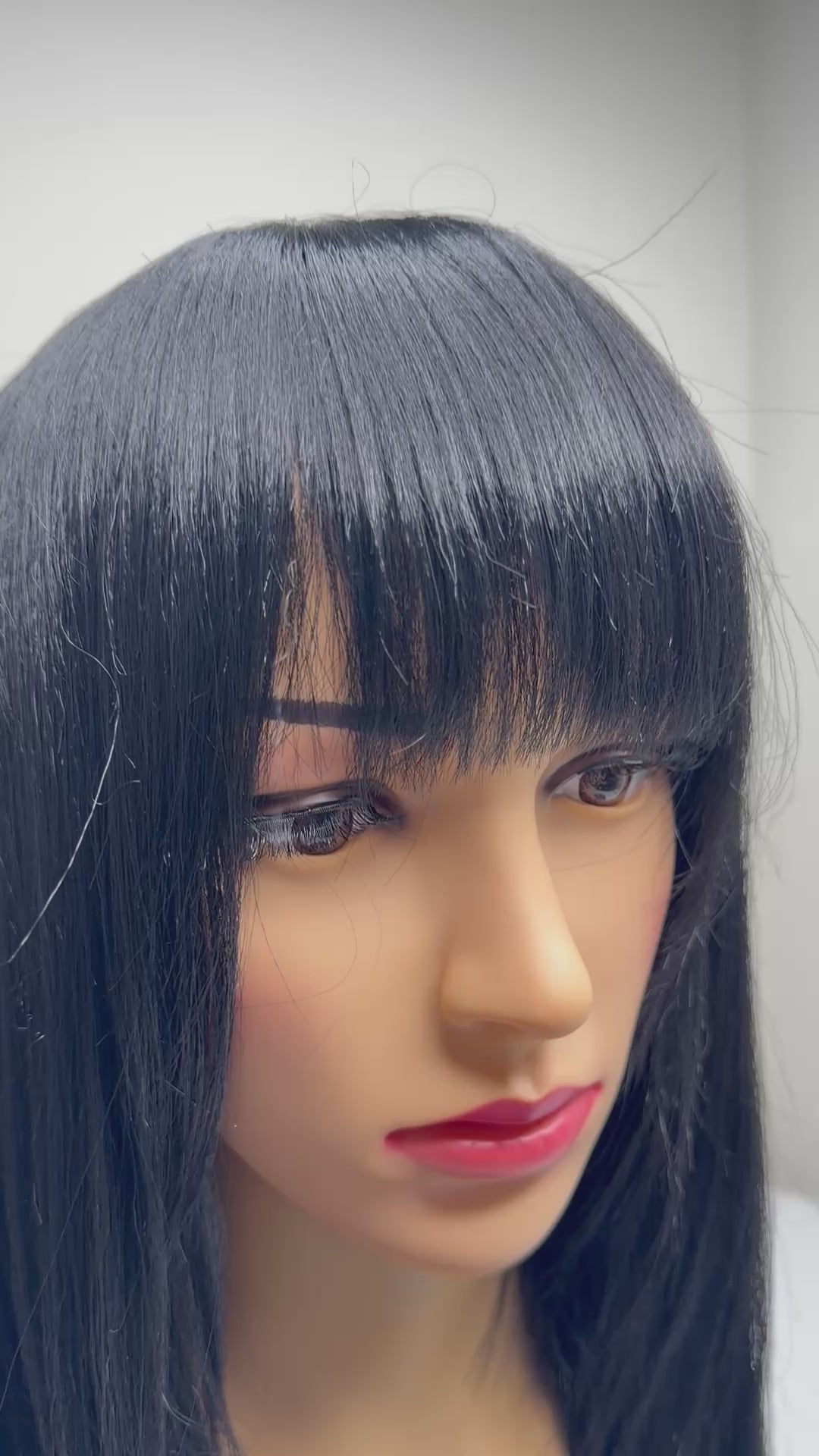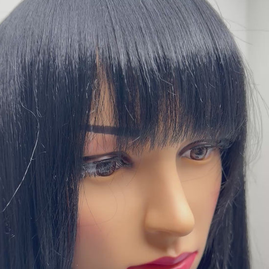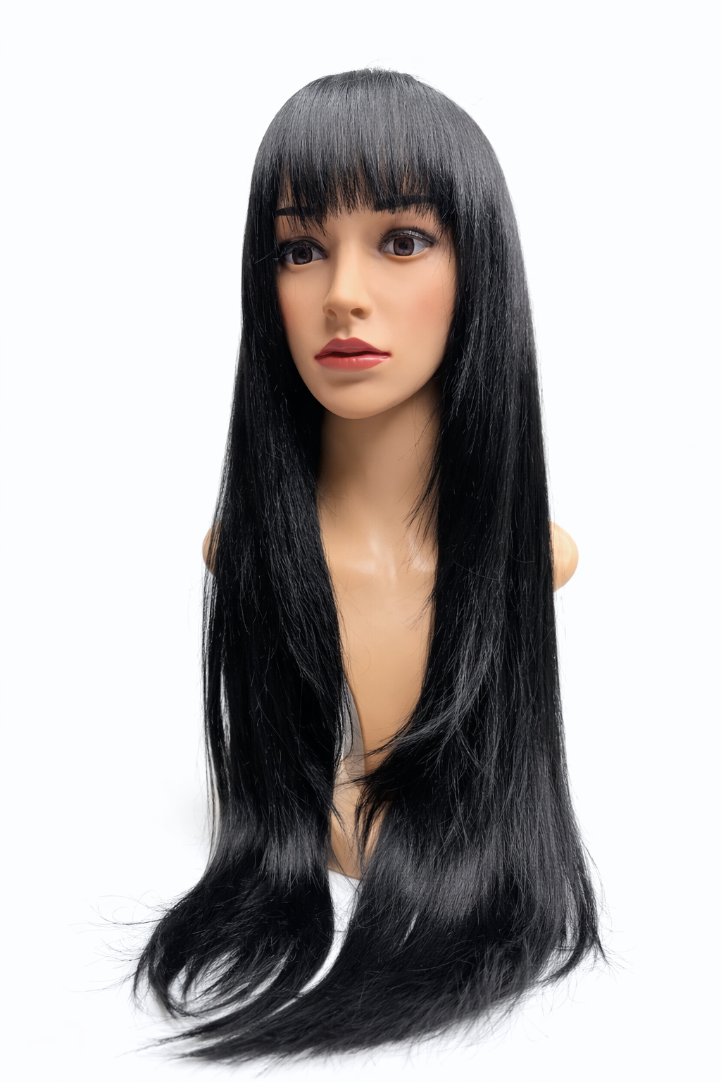 Transforma tu estilo al instante con esta peluca de acabado lacio y brillante. Su caída natural y su fleco recto crean un look moderno, femenino y muy favorecedor. Tono 1.